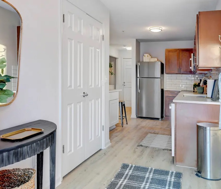 The renovated unit is absolutely amazing and definitely worth the extra money. I appreciate how the floors are a nice birch color instead of a boring gray like many other modern apartments implement– it makes it a lot easier to create a cozy space. I also love the white countertops and tile backsplash on the kitchen, and the updated appliances (especially the electric stovetop) have been amazing to work with. It’s been incredibly fun to decorate!